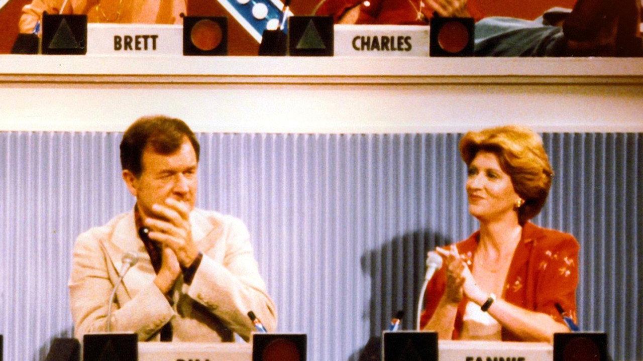Panelists Avery Schreiber, Brett Somers, Charles Nelson Reilly, Kate Jackson, Richard Dawson, and Fannie Flagg